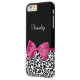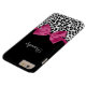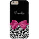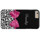 A trendy black and white leopard print Barely There iPhone 6 Plus Case with a vivacious dark pink ribbon tied into a cute girly bow. Personalise this chic and stylish animal pattern design by adding the name of your teen girl. Flat printed image, not actual ribbon.