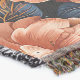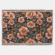 Vivid floral pattern with large, stylised peach-coloured flowers set against a dark background. The blossoms are detailed with rich textures and intricate designs, accompanied by lush green and gold-toned leaves that enhance the overall elegance of the composition.