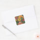 This multicolored striped cat with colourful, highly detailed markings is sitting in the shade of a dense, vivid garden teeming with exotic, ornately patterned plants and flowers in this unique and uplifting design.