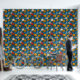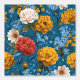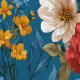 A bold, vibrant pattern featuring big yellow, cream, and red flowers on a bright blue background.