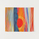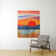 A semi-abstract ocean sunset behind a mountain range, in psychedelic colours of fiery red and orange, with dark indigo blue mountains