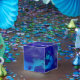 Sparkling ink texture favour box in accents of royal blue, turquoise and purple.