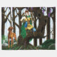 A red haired elf and her hunting dog are in a forest on the hunt.
