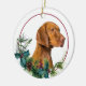 On the front of this Holiday ornament is a beautiful portrait of a Vizsla dog peeking out of a holly and evergreen bough. Red berries and pine cones decorate the holly and pine sprigs. The image is placed on a white circle within a thin red line circle. The back of the ornament has the same evergreen bough wreath and circle with your custom text in red.