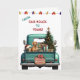 A teal blue pickup truck carries a decorated Holiday tree and gift packages on the front of this cute Christmas card. A red Vizsla dog looks out from the tailgate. A rustic wooden sign on the back bumper says "Christmas Cheer". At the top of the card is a string of Holiday lights, and custom text which currently says "From Our House to Yours". The inside of the card has more text fields for you to customise.