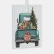 A teal blue retro pickup truck carries a decorated Holiday tree and gift packages on this cute glass Christmas ornament. Looking out from the tailgate is a beautiful red Viszla dog. A rustic wooden sign on the back bumper says "Christmas Cheer".