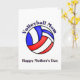 Happy Mother's Day to a Volleyball Mom. The front has a red, white and blue volleyball with Volleyball Mom curved around it. Inside is the same volleyball flying over a net with editable text saying, "You're the best on and off the court".