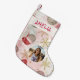 Celebrate the holidays with a sporty flair using this unique personalized Christmas stocking. Featuring a charming watercolor design with festive pink and red hues, sparkling golden snowflakes, and stylish volleyballs with Santa hats. Personalize with name and photo, making it an ideal gift for volleyball players, coaches, or fans. Hang it by the fireplace with care, ready for Santa to fill with treats, and add a special touch of their favorite sport to your holiday decor.