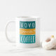 Vovo Needs Coffee Mug. This cute coffee mug makes the perfect gift for any grandmother whose grandchildren call her Vovo instead of Grandma. (Vovo means grandmother or grandma in Portuguese.) This funny coffee mug says "Vovo needs coffee." It has a white background with teal / turquoise / aqua and yellow graphics.