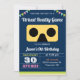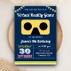 Amaze your guests with this cool birthday party invite featuring a yellow virtual reality headset with modern typography against a navy blue background. Simply add your event details on this easy-to-use template to make it a one-of-a-kind invitation. Flip the card over to reveal a colourful stripes pattern on the back of the card.