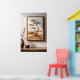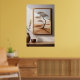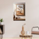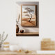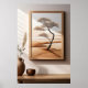 Poster of a solitary tree set against a serene beige and brown landscape hanging on a wall. The room also features a wooden table adorned with a ceramic vase and a smaller bowl. Sunlight filters in, casting subtle shadows across the scene.
