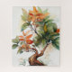 Jigsaw puzzle. A Wabi-Sabi image of a tree with a twisted trunk sits atop a rocky surface, showcasing vibrant, multicolored leaves. The background features soft, watercolor-like splashes that add an ethereal quality to the scene.