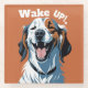 This delightful and vibrant design showcases a beaming dog with its eyes closed, clearly enjoying the moment, beneath bold white text that reads "Wake Up!" The design uses a playful mix of warm and cool tones, featuring shades of deep orange, white, black, and brown, giving it a cheerful yet cosy feel. The dog’s joyful expression, with a wide-open mouth and smiling eyes, captures the carefree and infectious energy that only our furry friends can offer.