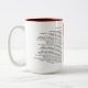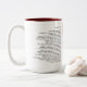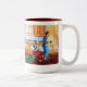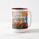A two tone coffee mug depicting the Illustration and Poem "Waked Parade"