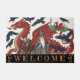 Wales Welcome Doormat featuring modern art with patriotic Welsh Flag together with a Large Red Dragon, wizard Merlin, ravens and viking bear in Art Nouveau style. Original winter whites, fun house mat for any occasion. Easily customise "welcome" text.