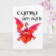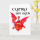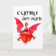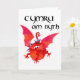 A patriotic greeting card with a handpainted collage of a red dragon and the Welsh slogan, 'Cymru am Byth'.