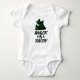 This baby bodysuit has a design that features the words "Walk By Faith" in a unique print with black letters and green shadow plus a pair of green and black tennis shoes with two heart cross signs in this faith based scripture quote theme. This bodysuit is standard fit with easy tear label plus easy on-and-off three snap closure and double-needle ribbed binding on all openings.