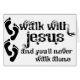 Christian t-shirts and gift ideas that features footprints on the left side with the saying, Walk with Jesus and you'll never walk alone.