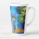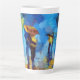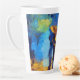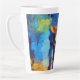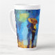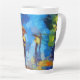 This custom latte mug features a hand painting of a couple carrying an umbrella as the raindrops are falling. The background consists of a colorful artistic landscape.