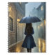 Woman from behind, with umbrella in the rain in an old alley, at night with old glowing street lamps