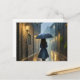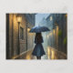 Woman from behind, with umbrella in the rain in an old alley, at night with old glowing street lamps