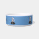 Walking cat on blue background, cat bowl. Add the name by replacing this text