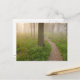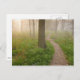 Postcard of a walking path through bluebells leading into a forest at sunrise on a foggy morning, creating a magical atmosphere.