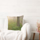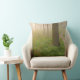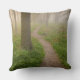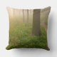 Throw pillow with a walking path through bluebells leading into a forest at sunrise on a foggy morning, creating a magical atmosphere.