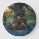 Cute Gnome house in a bark of tree surrounded by bluebells at sunset.