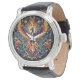 Make a bold statement with this striking wristwatch featuring a vibrant phoenix rising from flames, surrounded by intricate floral patterns. The detailed artwork on the watch face showcases rich shades of orange, yellow, and blue, symbolising renewal and strength. Paired with a sleek black leather strap and a silver-tone case, this timepiece blends artistry with elegance. Perfect for those who appreciate mythical designs and unique accessories, this watch is a timeless piece that adds a touch of power and sophistication to any outfit."