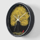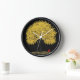 Beautiful wall clock with yellow leaves tree background and dark tree trunk, decorative.