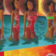 UNIQUE FUN RETRO STYLE WALLPAPER FEATURNING TWO WOMEN WITH AFRO HAIR STYLE ONN THE BEACH WEARING BIKINIS AT SUNSET. PAINTING BY ESTABLISHED ARTIST. GREAT ADDITION TO ANY LIVING SPACE, EVENT SPACE OR SHOP! EYE CATCHING AND VIBRANT.