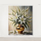 this flower image Sure, here is a watercolor painting of white lilies in a gold vase, bathed in warm light, with intricate and detailed brushstrokes, rendered in 8K ultra-high definition and sharp focus: