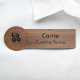 Mid Century Walnut Wooden Texture Employee Name Tag for Round Logo - Easily personalise this simple custom name tag with a simulated lovely walnut wooden texture easily. This template includes space for a company logo, employee name, job title, or other custom text. It's plastic and available with a safety pin back or a magnetic back fastener (do not use magnet with pacemakers). No minimum order quantity and no setup fee.