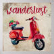 Cute poster with a whimsical painting of a red moped with a flower basket on the back. The moped has a trendy retro design. Ready for adventure. Wanderlust written in a fancy handwritten font. Inspirational typography. The background is a chic distressed looking texture with circles and random marks in a light brown colour.