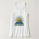 A golden sun rises over snowcapped teal mountain peaks in this retro inspired Wanderlust art. Made for adventurers, hikers, nature lovers and anyone who feels most alive when exploring the great outdoors. This scoop neck tank top is a great way to show off your wanderlust while you explore, or while daydreaming about your next journey. | Vivid printing is recommended for pink garments.