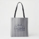 The perfect bag for a weekend getaway, to take to a farmers market or just to use for everyday. "In Wanderlust we trust" text with hand drawn mountain range on grey and white striped background.