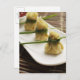 3 wanton dumplings placed in a row on a white plate with chilli sauce on the side. Copyright: Asia Images