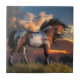 On old Native American warhorse, stands on a grassy hill watching the sunset. The clouds drifting through the sky are lit with fiery red light as they catch the rays of the sun. A breeze blows causing the pinto coloured mustang's black mane and tail to blow in the wind. Warpaint adorns this horse, but his rider is nowhere to be seen.