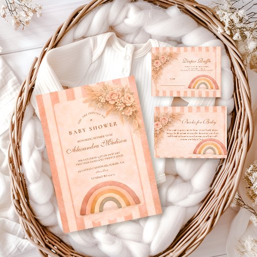 A warm and modern boho baby shower design featuring a soft neutral rainbow in earthy terracotta, sage, peach, and sand tones. Delicate dried florals and subtle textured details create an organic, minimalist look that feels both cozy and refined. Perfect for celebrating a mama-to-be who loves natural palettes, modern bohemian styling, and timeless simplicity.