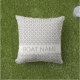Classic Warm Grey and White small geometric circles pattern otdoor pillow with modern minimal Boat Name Typography. The traditional Japanese Shippo pattern refers to the seven treasures of Buddhism. It embodies power, concentration and the interplay of different elements, a perfect decor idea for maritime outside seating areas, patios and decks. #ybeedesign #ybeesea #graygeometricpatternpillow #graygeometriccirclespattern Patio deck decorating ideas made with ocean love © Design y.BEE SEA
