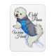 The design depicts a bichon in the snow with a warm jacket, heart and message.