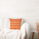 This throw pillow has an Art Deco design of a plaid with thick and thin lines in red, orange, and yellow.