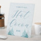 Warm up here hot cocoa bar sign with winter pine trees and falling snow blue quinceanera sign for wonderland theme quince. Large number of coordinating winter quince party supplies and 15 years invitations can be found in this beautiful birthday collection.