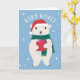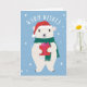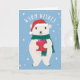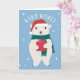 This whimsical and fun Christmas greeting card features a cute bear wearing a Santa hat and scarf and holding a holiday gift sending "Warm Wishes". The inside completes the sentiment reading "for a beary merry holiday".