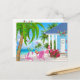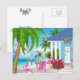 This tropical Christmas holiday greeting card features an adorable flock of colourful birds and a pink flamingo wearing a Santa hat. They are enjoying their beautiful beach house on the ocean.