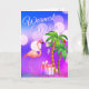 This Warmest Wishes Christmas holiday greeting card features a pink flamingo with decorated holiday palm trees and gifts on a tropical lit beach night. Inside Greeting ~ "From Our Holiday Paradise to Yours". ^