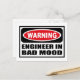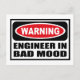 Warning ENGINEER IN BAD MOOD Postcard you can customise at www.WarningSignShirts.com and features a red and black warning sign and ENGINEER IN BAD MOOD in bold black letters to warn the world. You can also customise your own warning sign Postcard with the text you want.