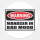 Warning MANAGER IN BAD MOOD Sticker you can customise at www.WarningSignShirts.com and features a red and black warning sign and MANAGER IN BAD MOOD in bold black letters to warn the world. You can also customise your own warning sign Sticker with the text you want.