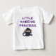 A trendy tee for a brave baby girl with the custom words "Little Warrior Princess" in a fun, stylish font and a funny, cute cartoon of a ninja monkey baby. I designed it specifically for a fierce little fighter who struggled after birth with some health condition.